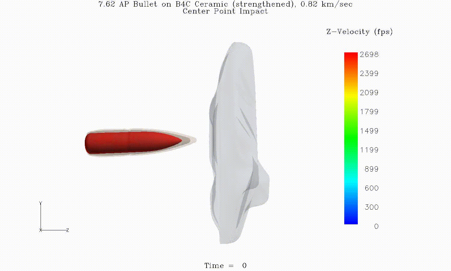 The impacting projectile is forced to dwell on the strike face surface. It collapses onto itself, mushrooming laterally. Within the ceramic, a compressive wave propagates to the back, returning as a tensile wave, pulverizing it. The projectile mass ablates away as it pushes through the abrasive rubble. Layers of polymeric ballistic fabric backing then catch the fragments.